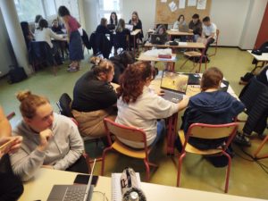 Après avoir découvert et joué à différents jeux vidéo, les jeunes ont travaillé sur le scénario d’un film collectif. Pas facile au début de prendre la parole, de donner des idées. L’enseignant propose de travailler selon une méthodologie déjà vue en classe. Tout d’abord, il faut définir une situation initiale pour poser le discours, les jeunes veulent que leur histoire se déroule au lycée. Ensuite, il faut trouver un élément perturbateur, ils décident qu’il s’agit d’un problème de réacteur à la centrale nucléaire de Penly toute proche. Il faut ensuite déterminer des péripéties, des actions qui vont occuper une grande partie du film. Il faut introduire un élément de résolution où les protagonistes solutionnent l’élément perturbateur. Et l’histoire se termine par une situation finale.